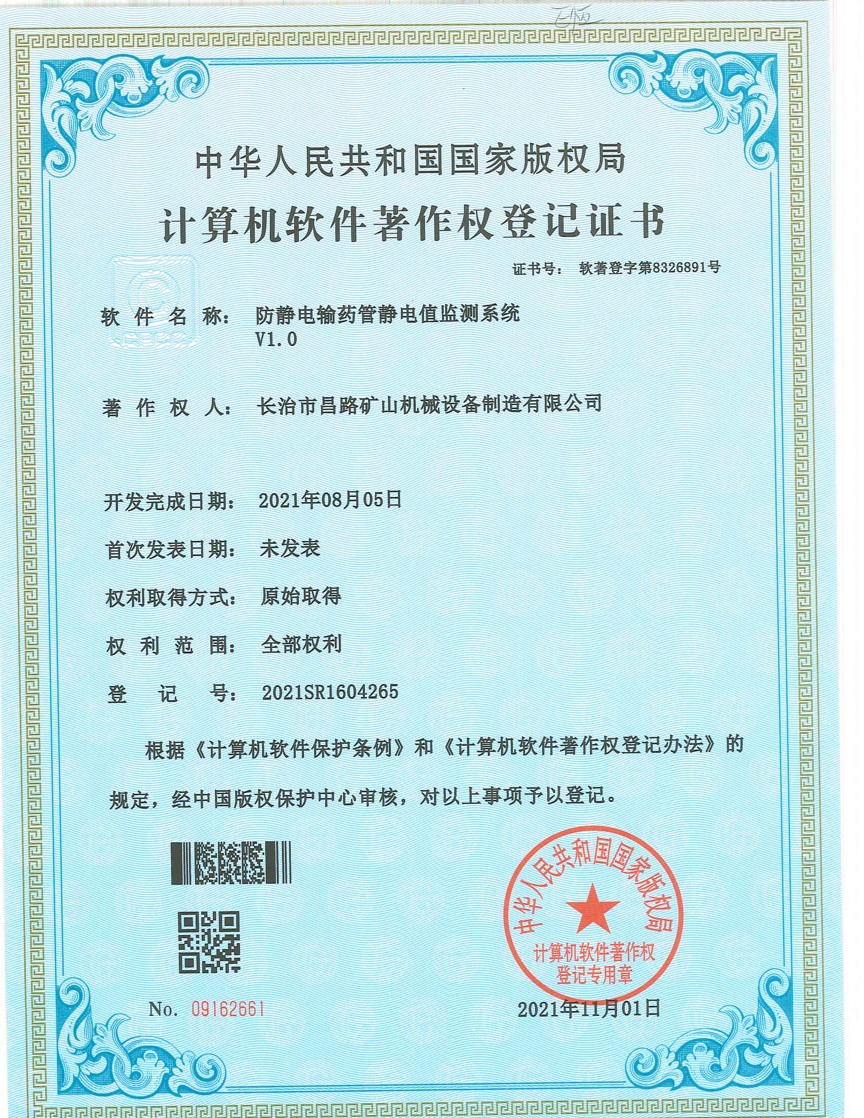 榮獲防靜電輸藥管靜電值監(jiān)測系統(tǒng)著作權(quán)登記證書